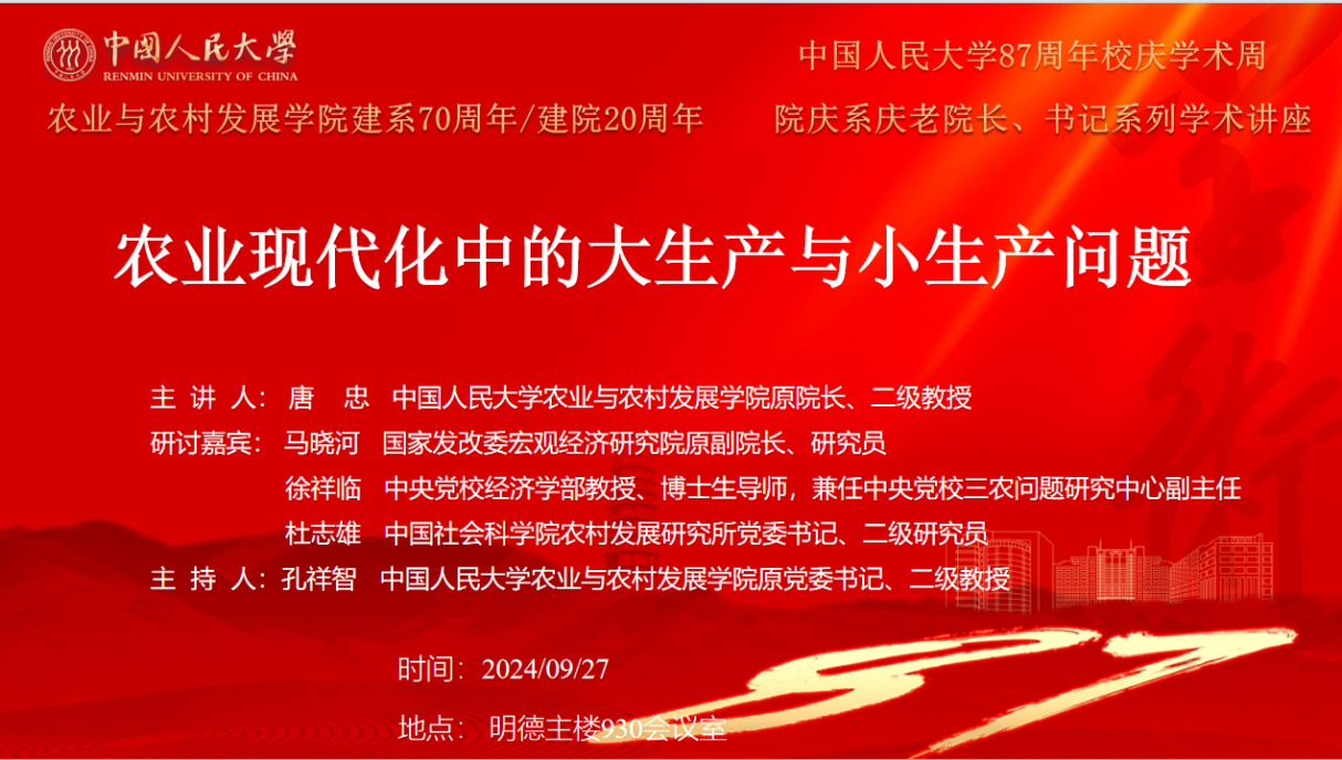 2024年9月27日下午,小說狂人 建系70周年/建院20周年院庆系庆老院长、老书记系列学术讲座第一讲——“农业现代化中的大生产与小生产问题”在明德主楼930会议室成功举办。本次讲座是学校87周年校庆学术周的系列活动之一。