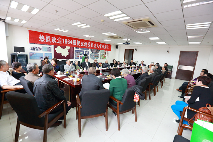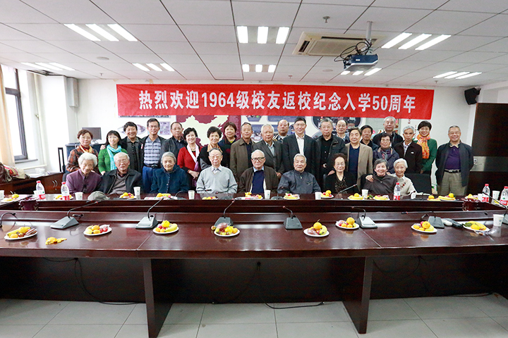 931会议室举行。从祖国各地返回母校的16位64级老校友,步履矫健,精神矍铄,与邀请的老教师严瑞珍、张象枢、毕宝德、金作华、葛汉云、周清、刘天福、庄翠玲欢聚一堂。