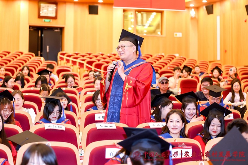 党委常委、常务副校长朱信凯致辞。他代表学校向圆满完成学业的328名毕业生同学们表示热烈的祝贺,并对同学们提出了三点期望:第一,做到“心中有理想”,为人生出彩锚定航向。“实事求是”是每一位人大人做人做事的基本遵循,更是探求真理的制胜法宝。第二,追求“手中有本领”,为人生出彩蓄力扬帆。毕业不是学习的终结,而是新的学习的开始,要善于学习新知识、勤于掌握新技能、敢于攀登新高峰。第三,保持“脚下有力量”,为人生出彩满舵前行。当今世界,充满变数与不确定性,唯有脚踏实地,辛勤耕耘,国家才能发展进步,个人才能取得成功。朱信凯常务副校长真诚希望毕业生同学们始终牢记习近平总书记的政治嘱托,真正做到用脚步丈量祖国大地,用眼睛发现中国精神,用耳朵倾听人民呼声,用内心感应时代脉搏,把对祖国血浓于水、与人民同呼吸共命运的情感贯穿学业全过程、融汇在事业追求中;始终不忘“复兴栋梁、强国先锋”的使命,在人民群众中奋斗,在基层一线奋斗,为农业强国建设挺膺担当,继续书写无愧于时代、无愧于人民、无愧于历史的青春业绩!